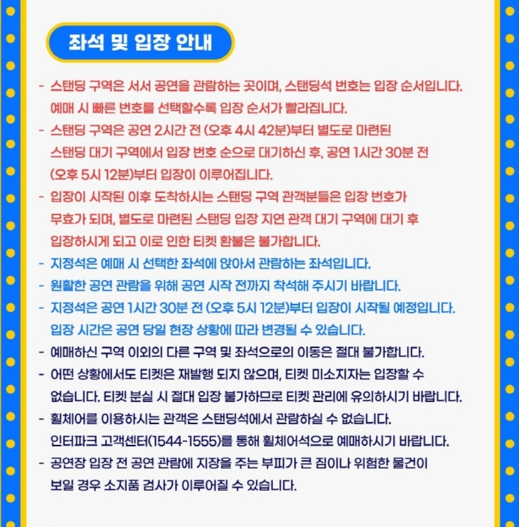 입장안내를 보시면, 2시간 전부터 입장 순서로 대기 후, 공연 1시간 30분 전에 입장이 시작된다고 되어있는데요. 스탠딩 관람객은 입장 순서가 적힌 팻말 앞에 순서대로 줄지어 서게 됩니다.