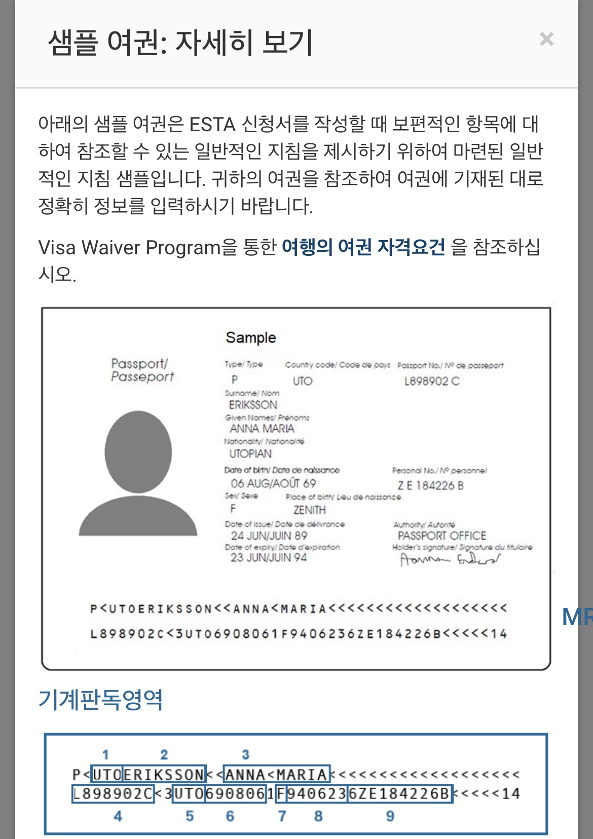 신청자 정보 입력 단계에서는 여권 업로드를 가장 먼저 하게 됩니다. 샘플 여권과 같은 여권 앞장을 촬영 후 업로드하시면 정보를 읽어서 기본 정보가 세팅됩니다.