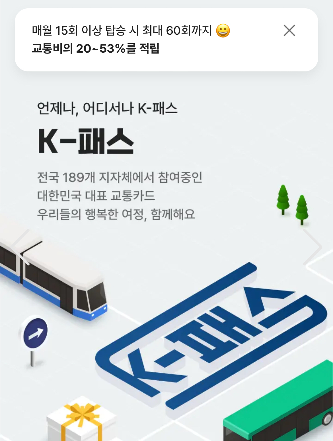 K패스 교통카드는 여러 교통수단을 이용하는 직장인이 가장 많이 절약할 수 있는 카드라고 말할 수 있습니다. 간편한 충전 방법과 파격적인 할인 혜택, 스마트한 부가 서비스까지 제공되어 저는 만족도가 매우 높습니다. K패스 계속되길 바래봅니다 ㅎㅎ
